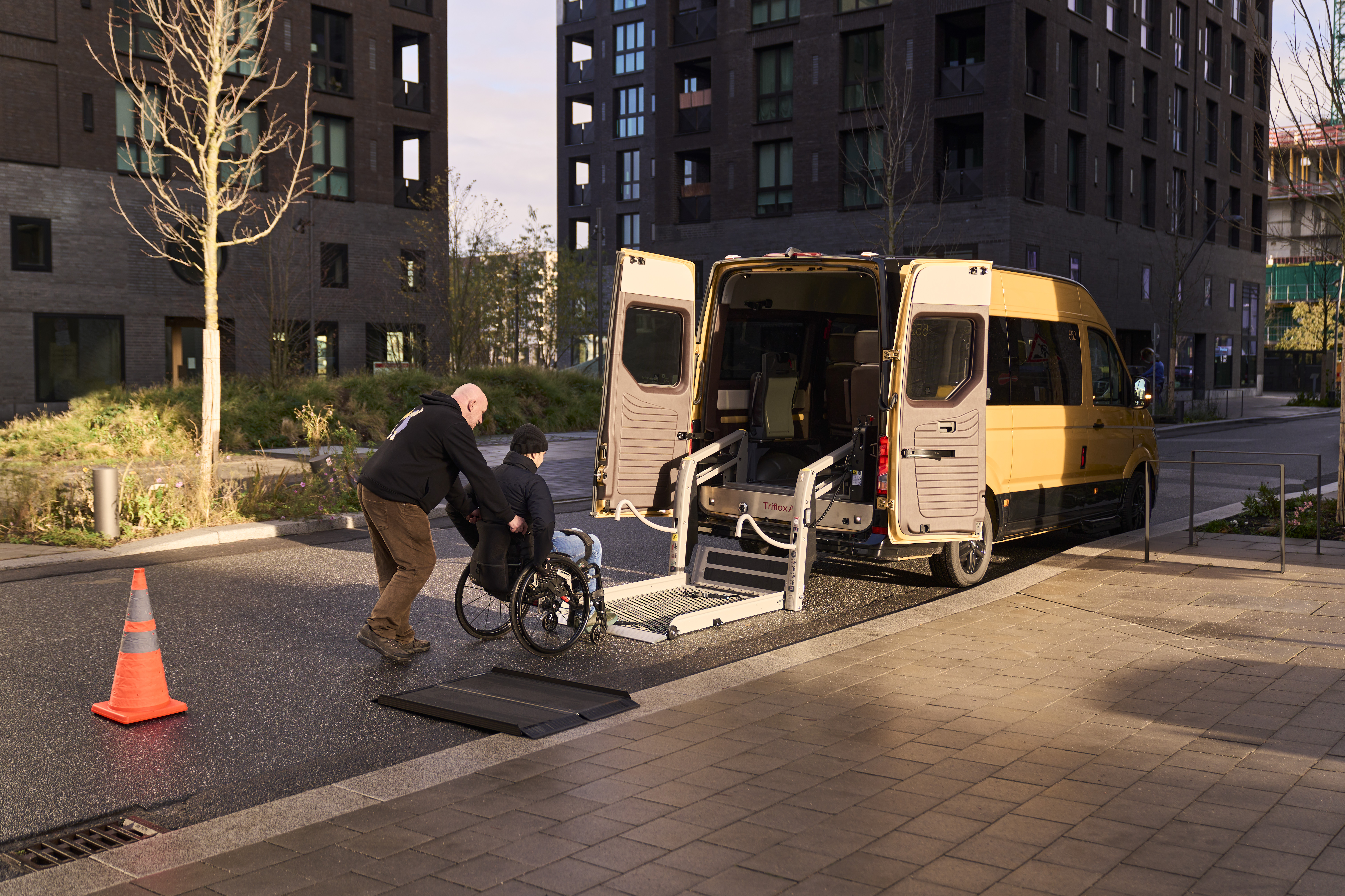 Um Menschen mit Handicap ebenfalls die Mobilität erleichtern zu können, sind 15 Fahrzeuge mit einer Rampe ausgestattet, sodass auch Rollstuhlfahrer bequem mitfahren können. Damit wird gewährleistet, dass Menschen mit und ohne Handicap gemeinsam fahren können. Bei einer Fahrt mit einem Rollstuhlfahrer können drei weitere Fahrgäste ohne Rollstuhl transportiert werden. Um optimale Sicherheit im Fahrzeug zu gewährleisten, wird der Rollstuhl mit einem Bodensicherungssystem im Fahrzeug befestigt. Zusätzlich wird der Rollstuhlfahrer selbst mit einem Dreipunktgurt gesichert. Damit man als Rollstuhlfahrer mitfahren darf, sollte der Rollstuhl nicht breiter als 75 cm und nicht länger als 100 cm sein. Die maximale Höhe von 155 cm darf nicht überschritten werden. Außerdem dürfen die im Rollstuhl mitfahrende Person und der zu transportierende Rollstuhl zusammen nicht mehr als 250 kg wiegen.